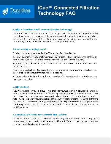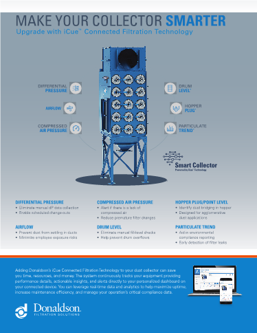 Adding Donaldson’s iCue Connected Filtration Technology to your dust collector can save you time, resources, and money. The system continuously tracks your equipment providing performance details, actionable insights, and alerts directly to your personalized dashboard on your connected device.